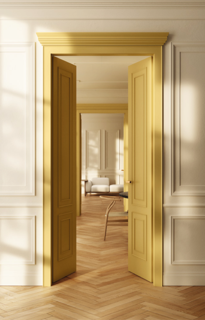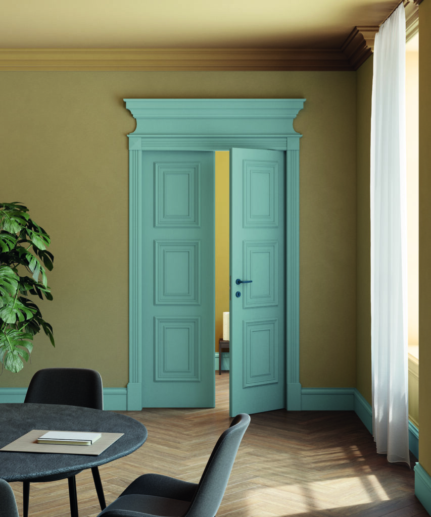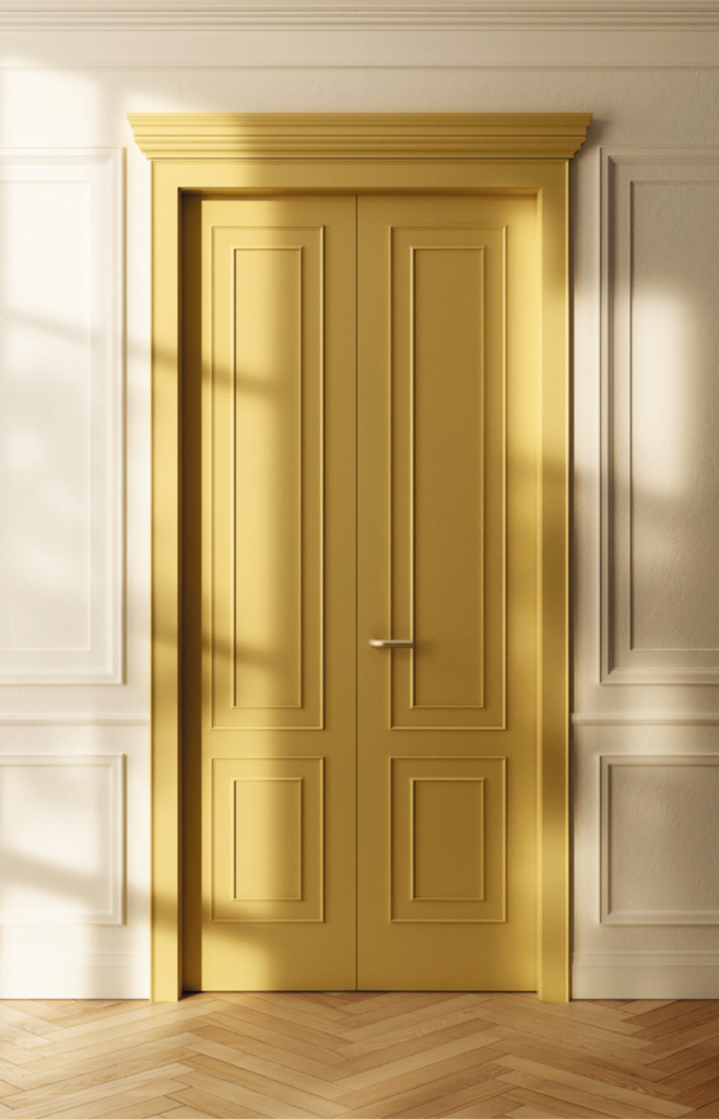 Porta battente due ante mod. Gilda C SSC laccata in color mustard, con maniglia Effe Classic in ottone satinato e con applicazione di sagoma liscia
