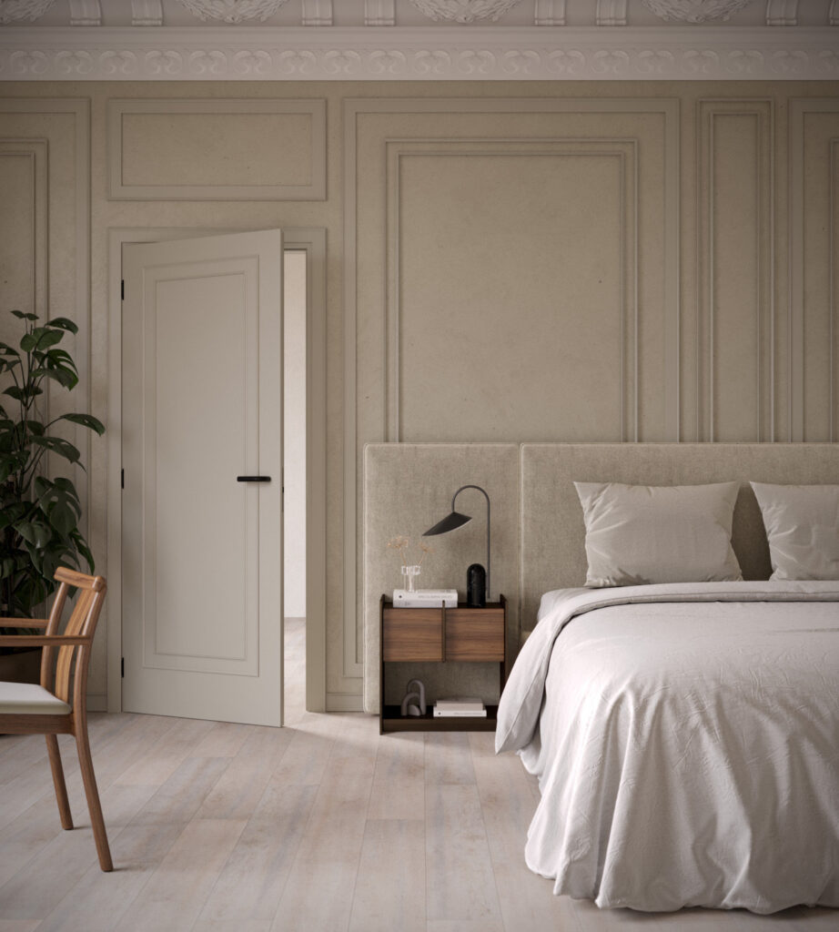 Porta battente mod. Gilda BSC laccata color Effebiquattro taupe, con maniglia Effe Classic nera ONO e con applicazione di sagoma liscia. Sopra dettaglio variante sagoma Gilda lavorata.