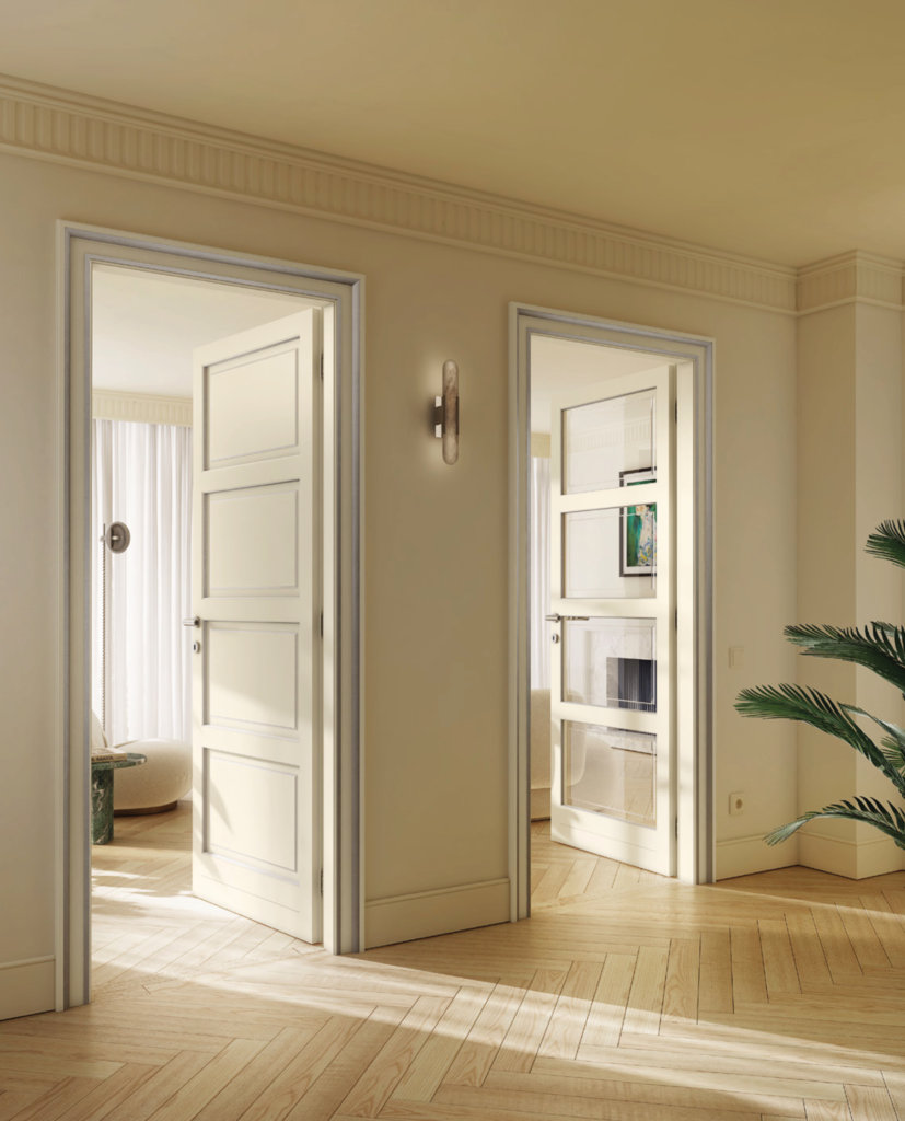 Porta battente due ante mod. Boheme C ssc laccata bianca. Maniglia Effe Classic in ottone satinato