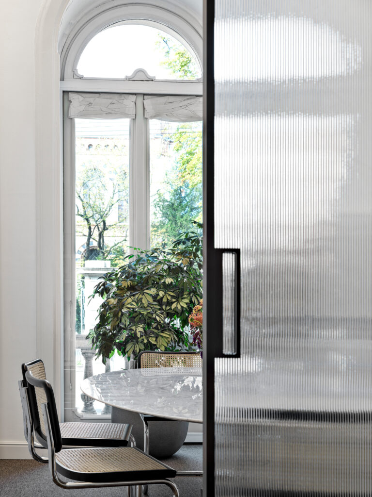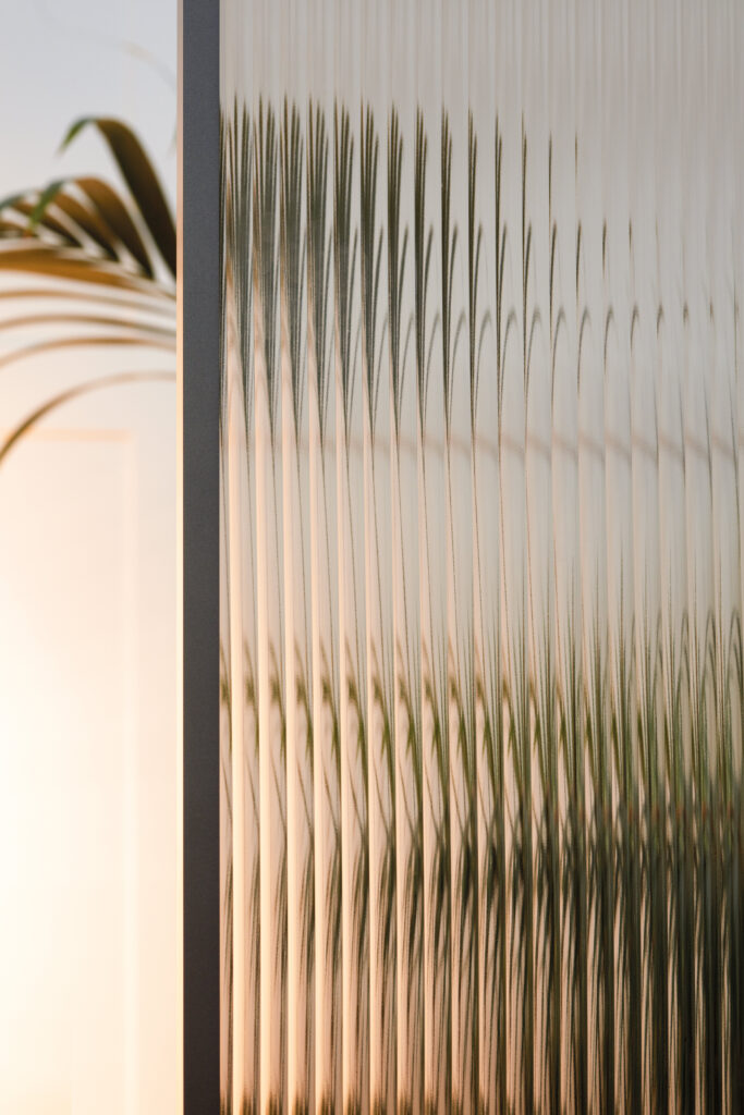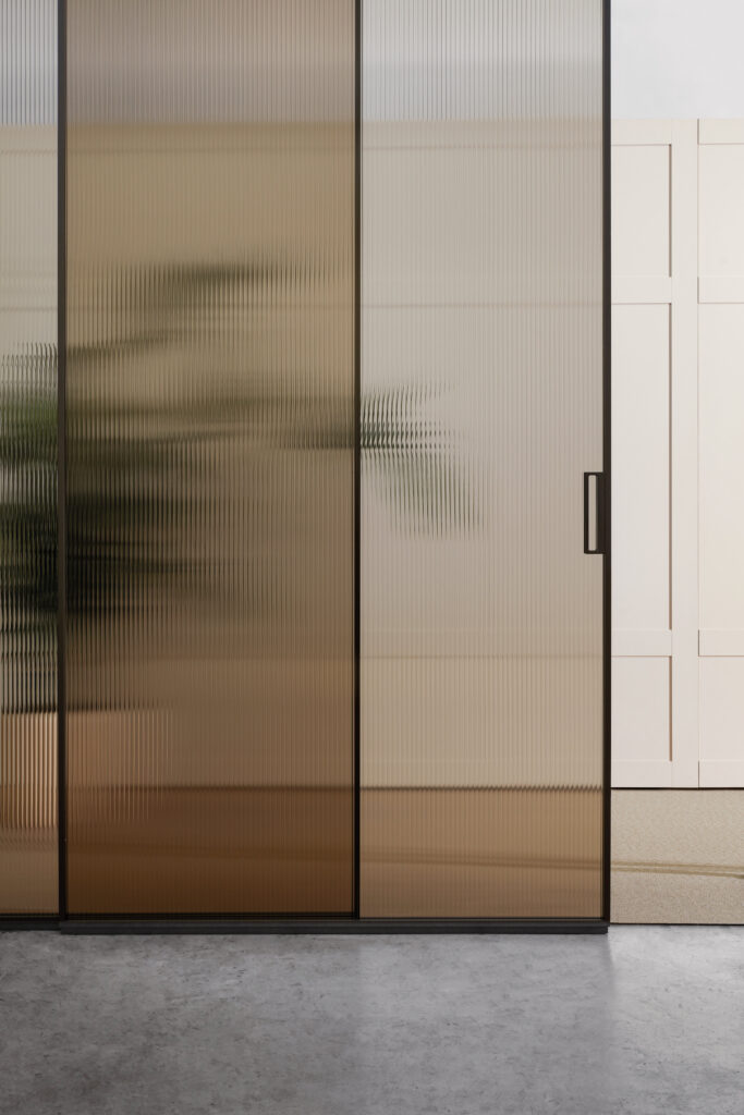 Sistema scorrevole Aria in vetro cannettato e profilo in alluminio verniciato